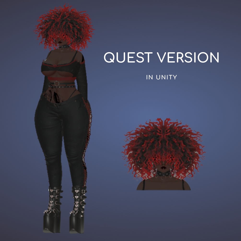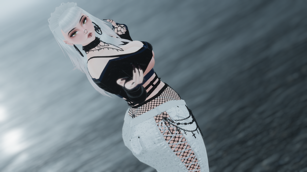 - Top, Bra, Thong, Fishnets, Skirt, Jeans, Arm accessories, Rings, Boots x2, Afro, Long hair, Short hair, Piercings, Harness, Necklace, Pubic hair shapes, Pubic hair on/off, Tattoos
