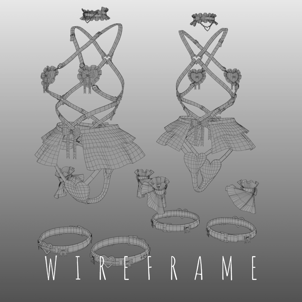 - 7 mesh's in total 44.7k tris, pasties, harness, undies, skirt, wrist cuffs, choker and garters.